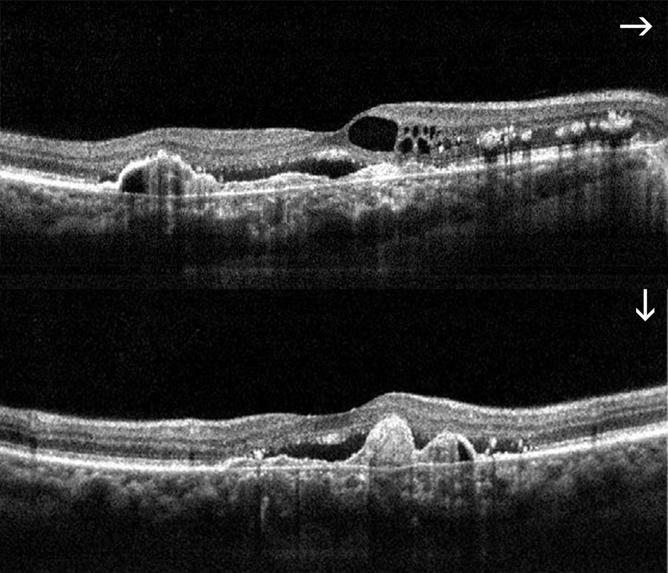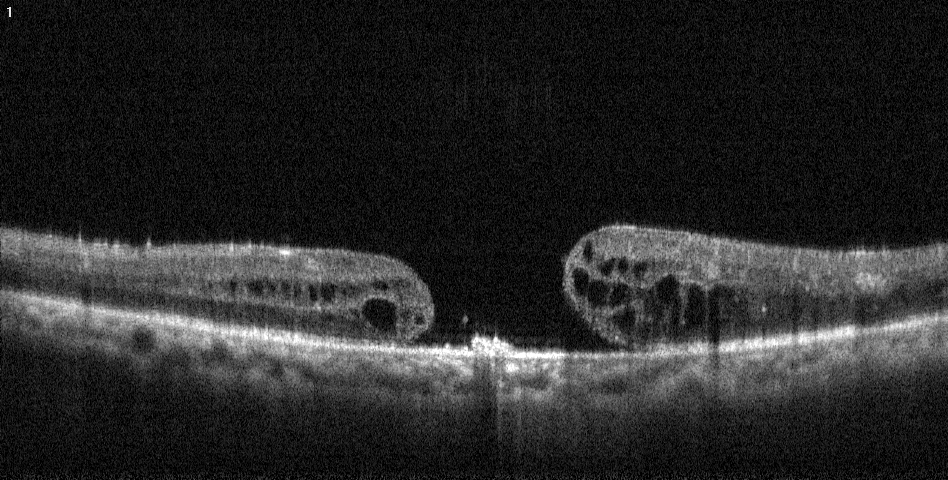 - Estudio de la mácula, estructura de la retina responsable de la máxima agudeza visual. La OCT nos permite realizar cortes histológicos de la retina, desde la cara anterior a la posterior y analizarla microscópicamente, permitiéndonos observar los cambios patológicos que produzcan. Es una prueba fundamental en el seguimiento de pacientes con Degeneración macular asociada a la edad (DMAE), edema macular diabético, edema macular secundaria a trombosis, agujero macular, membrana epirretiniana, tracciones vítreo-maculares, coroidopatía serosa central, etc.