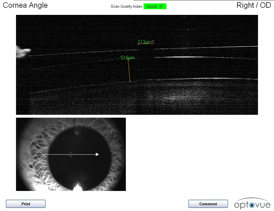 - Córnea, la OCT-Tomografía Coherencia Óptica nos permite realizar cortes completos de la córnea, que nos permite obtener la paquimetría corneal, estudiar las cicatrices y su profundidad.